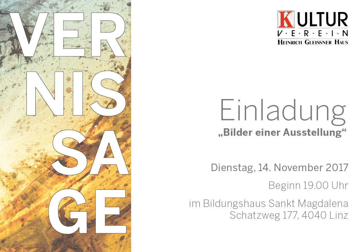 Am Dienstag 14. November findet im Bildungshaus St Magdalena in Linz die Vernissage „Bilder einer Ausstellung“ statt. Veranstalter ist der Kulturverein Heinrich Gleißner Haus Linz.