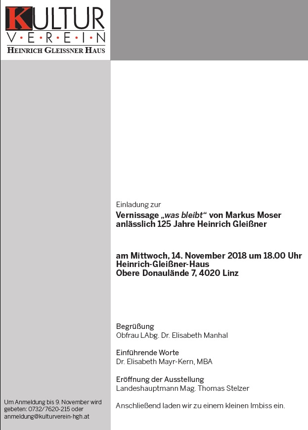 was bleibt“ – ist der Titel der Ausstellung vom Scharnsteiner Künstler Markus Moser im Heinrich-Gleißner-Haus in Linz. Die Ausstellung wurde kürzlich von Kulturreferent und Landeshauptmann Mag. Thomas Stelzer eröffnet. Ausgerichtet wird die Ausstellung vom Kulturverein Heinrich-Gleißner-Haus anlässlich des 125. Geburtstag von Heinrich-Gleißner (Jänner 1893).