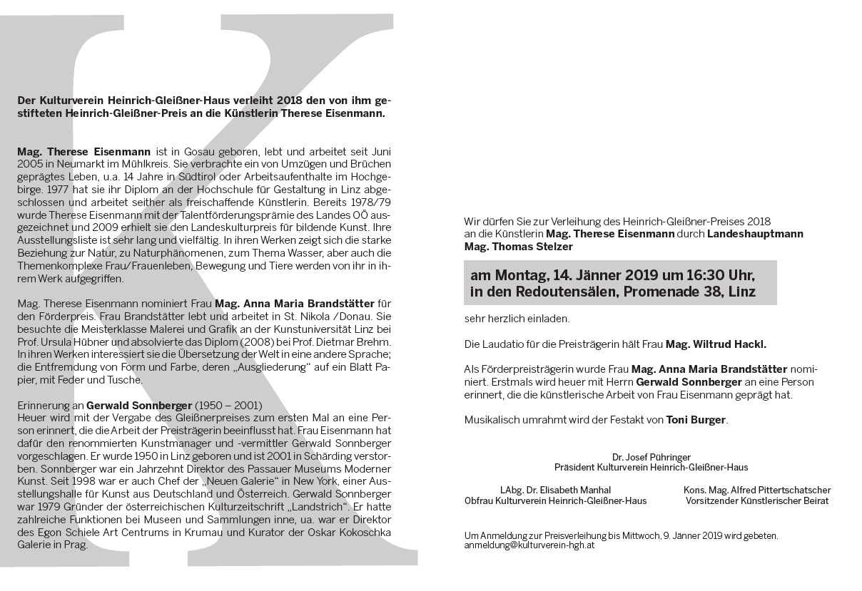 Heuer wird mit der Vergabe des Gleißnerpreises zum ersten Mal an eine Person erinnert, die die Arbeit der Preisträgerin beeinflusst hat. Frau Eisenmann hat dafür den renommierten Kunstmanager und -vermittler Gerwald Sonnberger vorgeschlagen. Er wurde 1950 in Linz geboren und ist 2001 in Schärding verstorben. Sonnberger war ein Jahrzehnt Direktor des Passauer Museums Moderner Kunst. Seit 1998 war er auch Chef der „Neuen Galerie“ in New York, einer Ausstellungshalle für Kunst aus Deutschland und Österreich. Gerwald Sonnberger war 1979 Gründer der österreichischen Kulturzeitschrift „Landstrich“. Er hatte zahlreiche Funktionen bei Museen und Sammlungen inne, ua. war er Direktor des Egon Schiele Art Centrums in Krumau oder Kurator der Oskar Kokoschka Galerie in Prag.