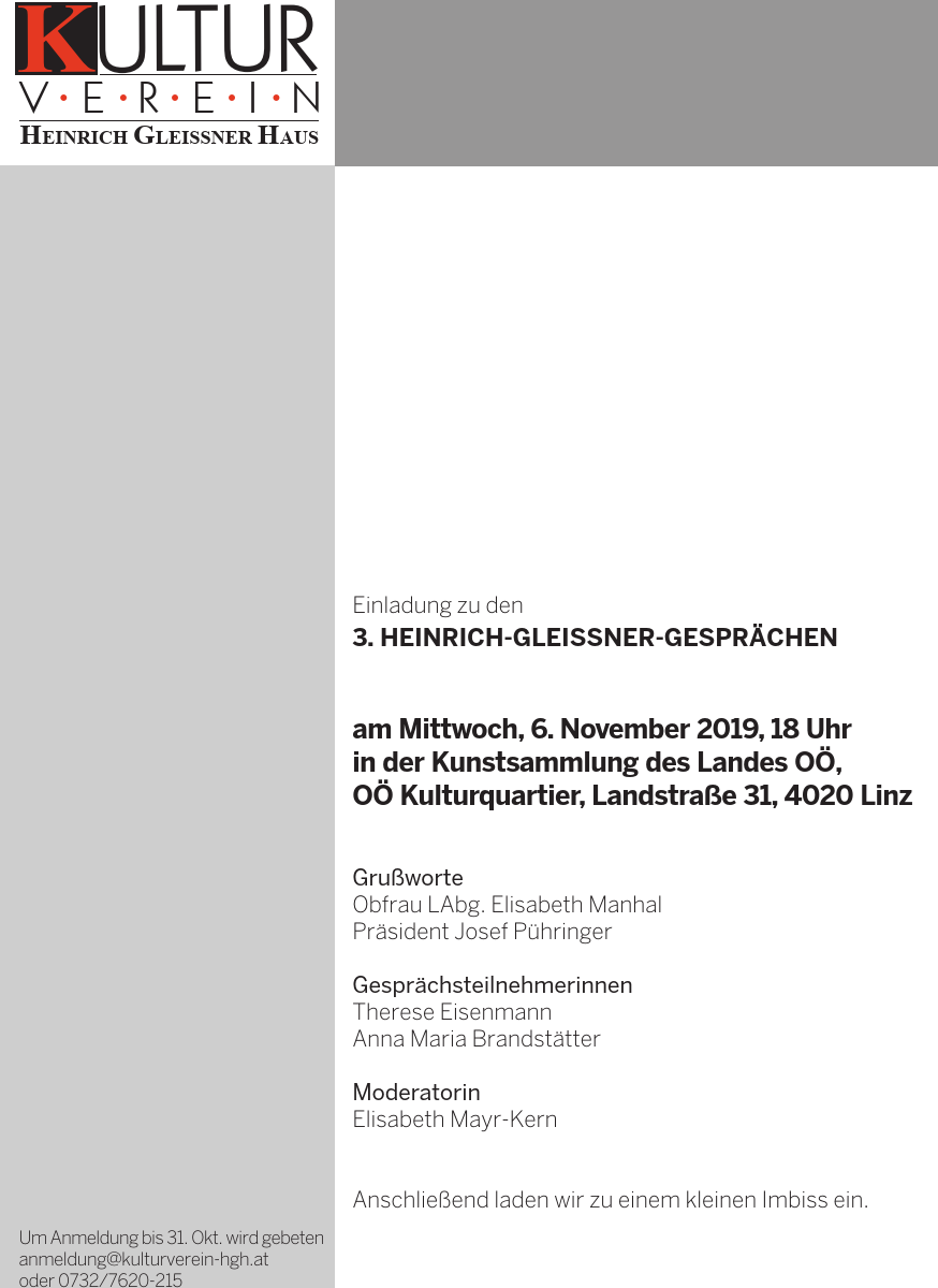 Seit 1985 zeichnet der Kulturverein „Heinrich-Gleißner-Haus“ auf Vorschlag des Künstlerischen Beirates jährlich eine bedeutende Persönlichkeit des oberösterreichischen Kulturlebens aus. In diesem Jahr wird die Auszeichnung zum 34. Mal vergeben, und zwar in der Kategorie Bildende Kunst.