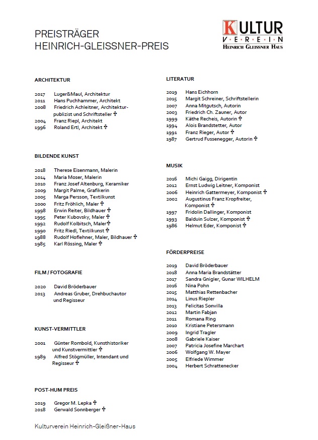 Seit 1985 zeichnet der Kulturverein „Heinrich-Gleißner-Haus“ auf Vorschlag des Künstlerischen Beirates jährlich eine bedeutende Persönlichkeit des oberösterreichischen Kulturlebens aus. Im Jahr 2020 wird die Auszeichnung zum 36. Mal vergeben, und zwar in der Kategorie Film und Fotografie. Ein besonderes Jahr braucht besondere Entscheidungen, so wurde der Heinrich-Gleißner-Preis 2020 an zwei oberösterreichische Künstler vergeben. Dotiert ist der Preis dieses Mal mit jeweils 2.500 Euro.